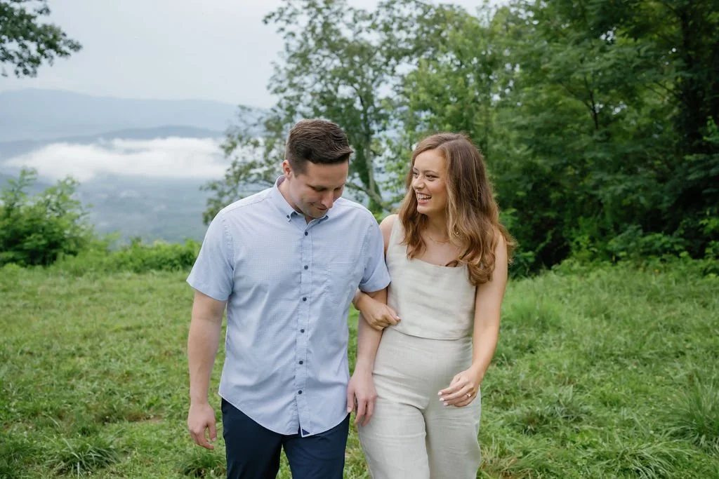 Something that I loved about Ben and Emily’s Smoky Mountain engagement photos were their outfits! They truly had a timeless wardrobe that complimented not only each other, but also the foggy backdrops of the Foothills. The cream and blue tones of their clothing looked especially wonderful in front of the lush bright greens of the Smokies woods. In addition, their outfits looked dressed up in a very casual and comfortable way. Absolutely perfect for a Smoky Mountain engagement session!