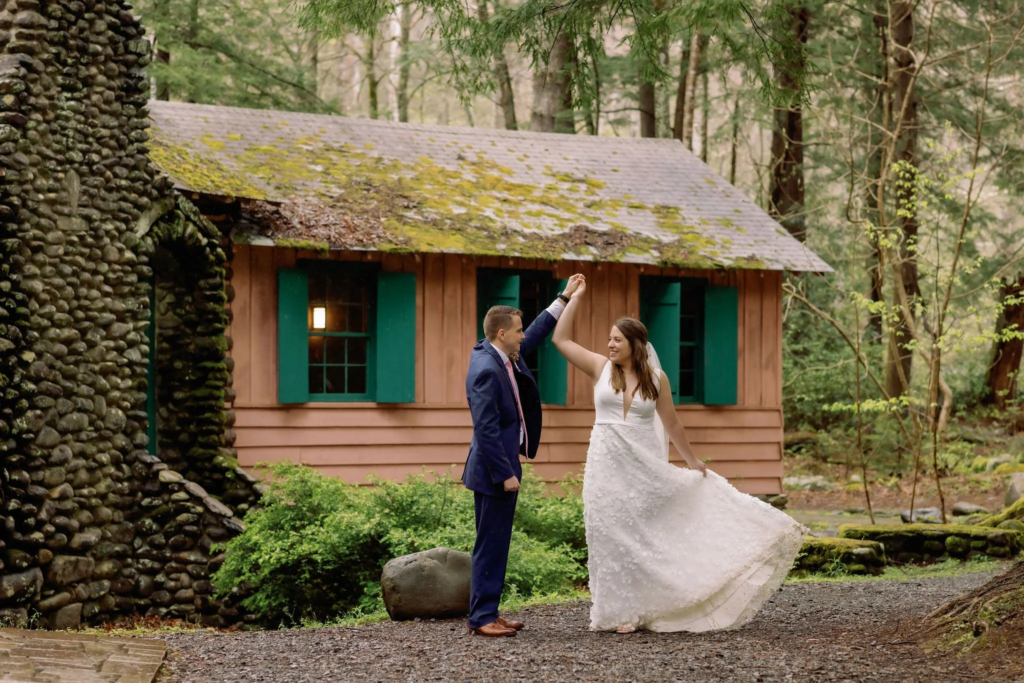 Tucked in the historic Elkmont district, Spence Cabin is one of the most romantic and charming Smoky Mountain wedding locations. This restored pink cottage sits beside the Little River and offers a mix of cozy indoor spaces and peaceful outdoor patios. The sound of the river and the soft rustling of leaves create a quiet, intimate setting for small ceremonies and elopements.