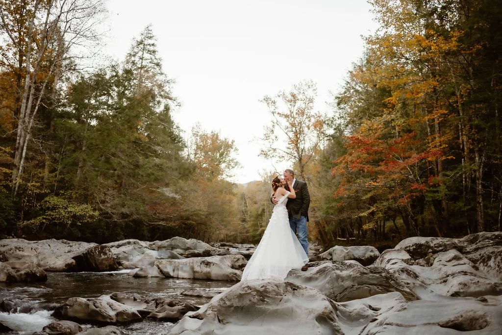 If you’re drawn to forested riverbanks and soft, natural light, Greenbrier Riverside might be your perfect Smoky Mountain wedding location. Located just a short drive from Gatlinburg, this lush and less-traveled area features the Little Pigeon River flowing through moss-covered rocks, shaded by towering trees. It’s particularly popular in spring and summer when the forest is full of green life.